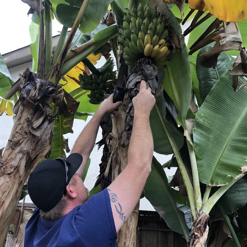 We all know a family like the Latasas. Eternally chill, not an inch of social awkwardness, and an ease of existence based on simple pleasures of family, friends, good food and definitely good libations. If you don’t have a Latasa family in your inner circle, go and find them. They are probably kicking back at the beach right now enjoying the new pace of no school and less work. The Latasas have three generations of bananas growing in their backyard, planted by Rico’s dad many years ago that are now part of the steady food supply that makes its way from the yard to the kitchen. According to Amber, these “apple crisp” bananas are the sweetest variety you can find, and they are always eaten just as they come, straight from the bushel.